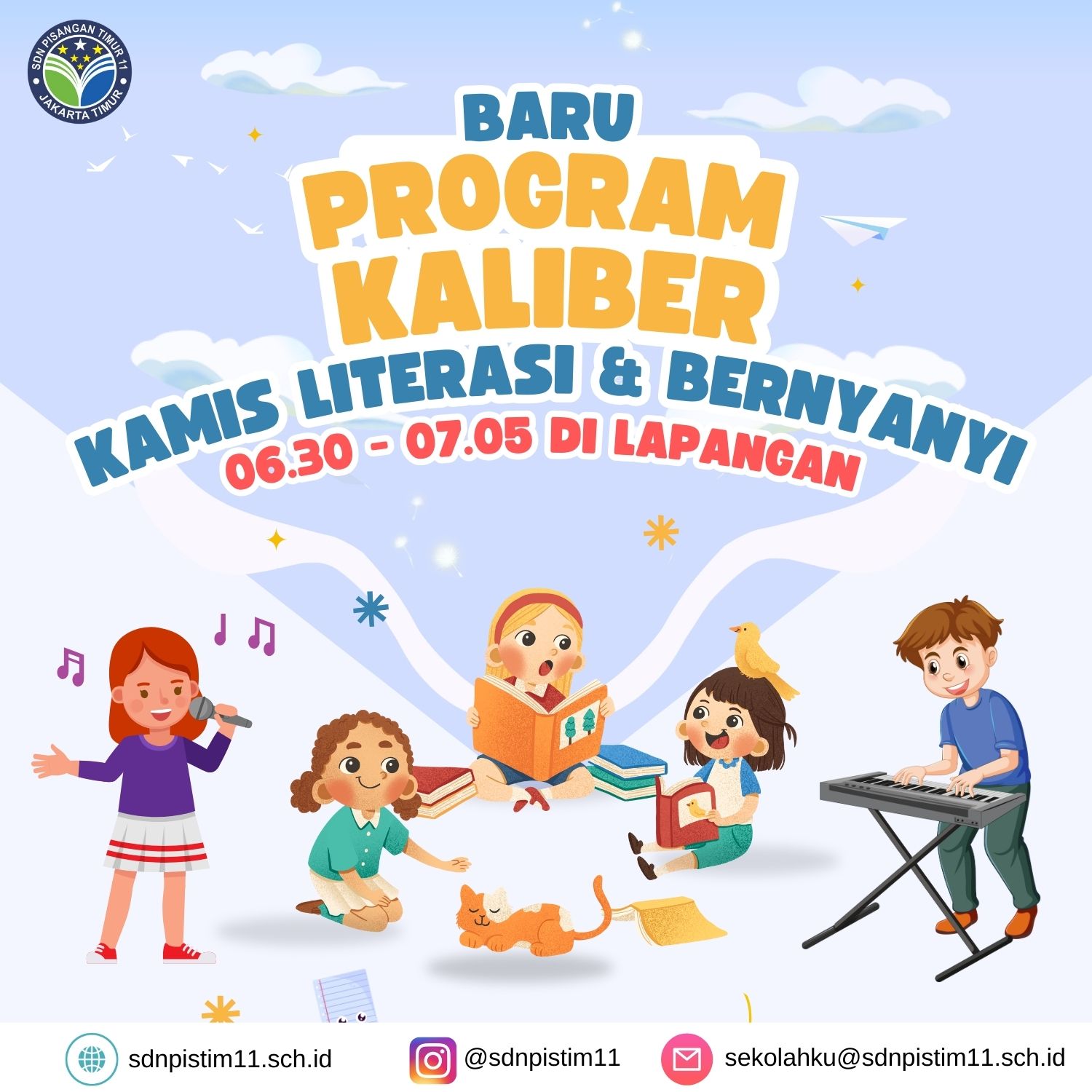 Program “Kamis Literasi dan Bernyanyi” (Kaliber) adalah inisiatif yang digagas oleh Kepala SDN Pisangan Timur 11, Dhina Maylani Rusdha, untuk meningkatkan minat baca dan keterampilan literasi siswa melalui kegiatan yang menyenangkan dan interaktif. Program ini dilaksanakan setiap hari Kamis pada jam pertama, yaitu pukul 06.30 hingga 07.05.